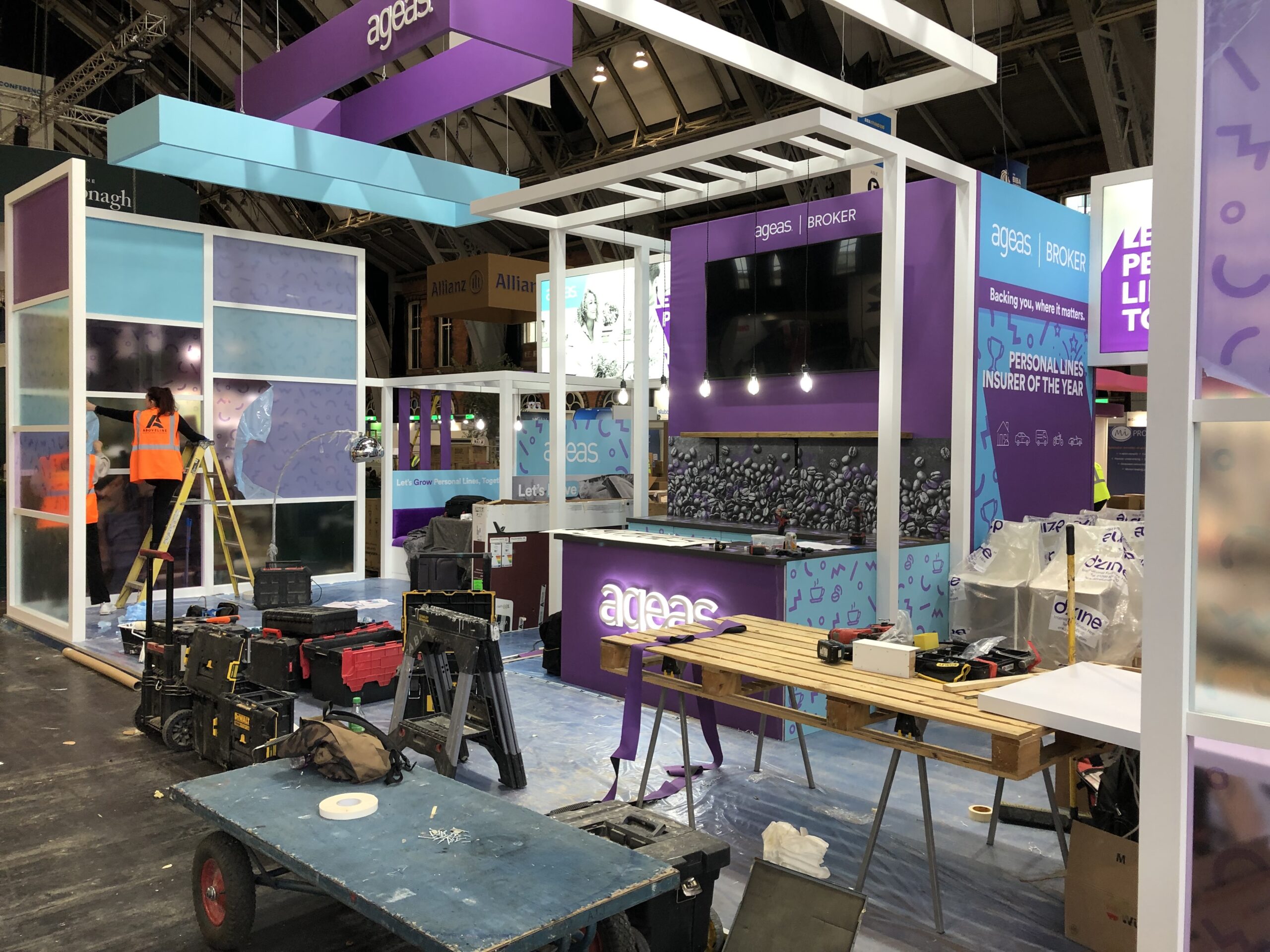 Creating the Ageas stand involves working closely with their graphic design agency – a rewarding collaboration that adds a unique project management twist to the process. As with many of our clients, sustainability is also key for Ageas, so we make sure multiple components can be reused year after year. With Aboveline quality throughout the design and manufacturing, it’s no problem to bring components back time and again.
